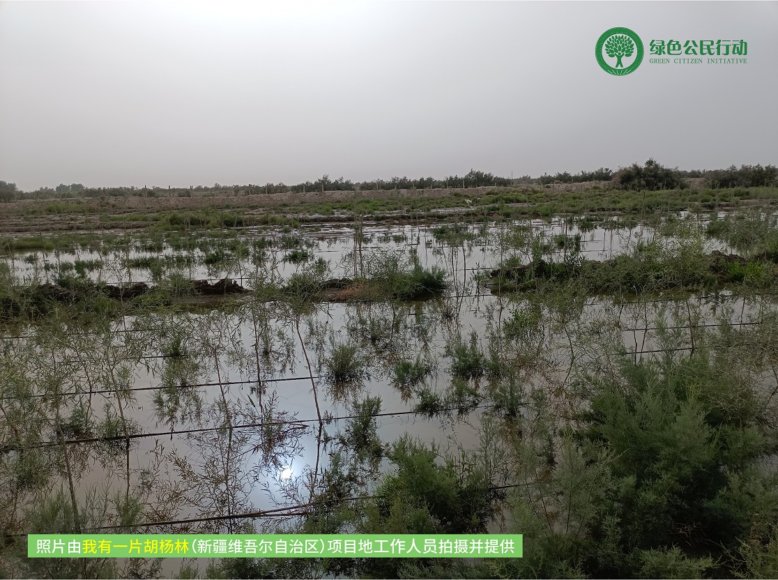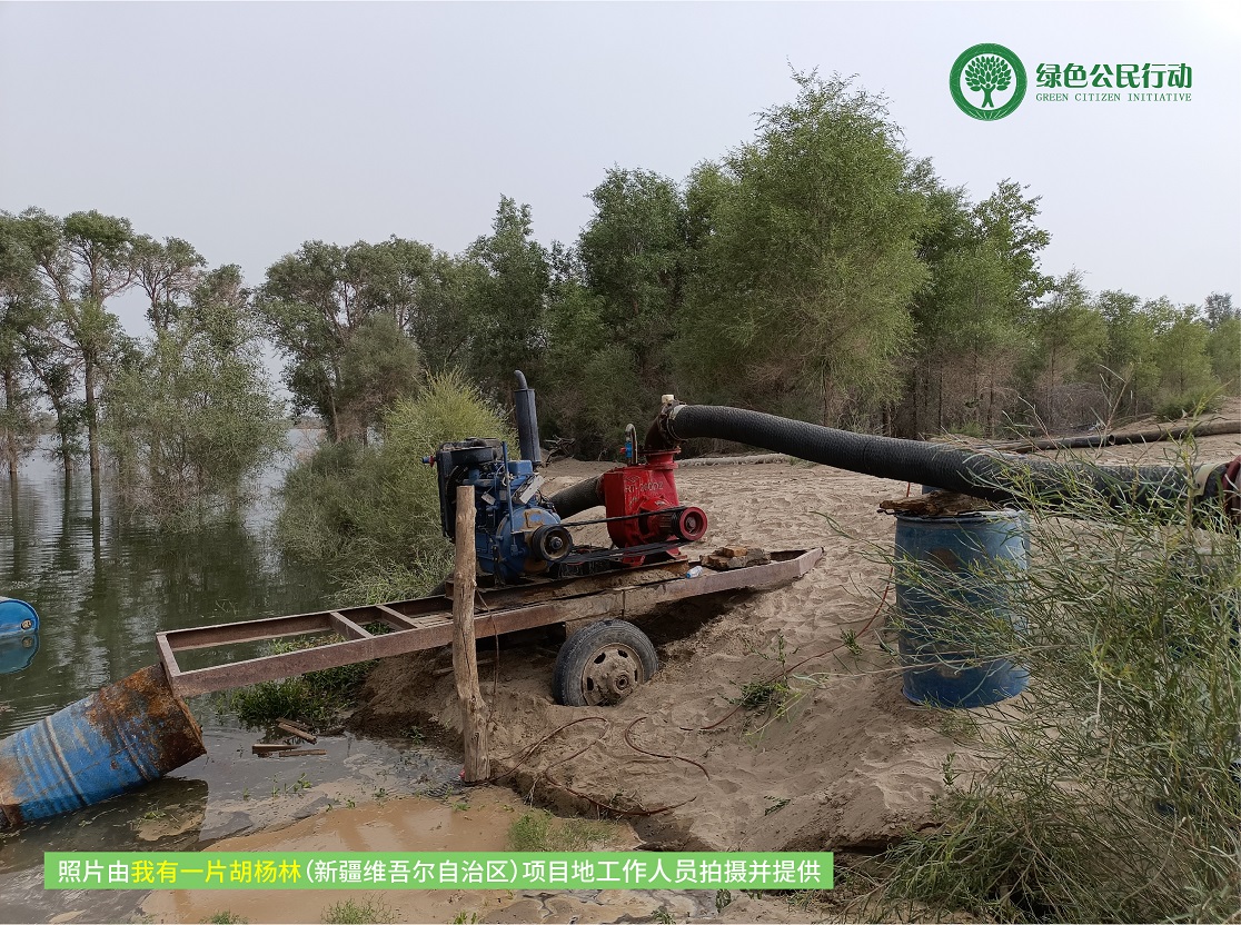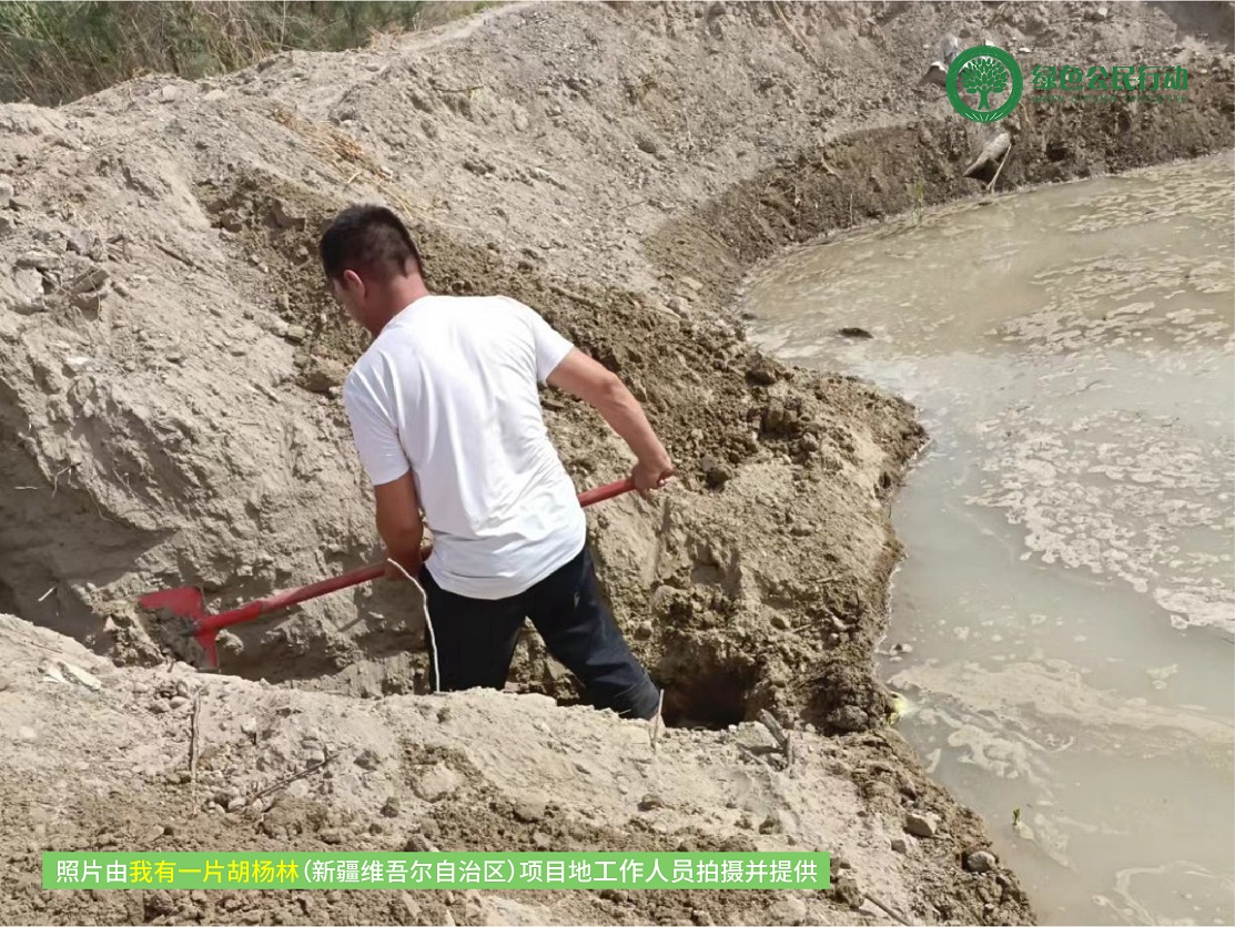 持续的高温天气,让胡杨对水的需求更为明显。项目区的七月初仍为枯水期,主要以滴灌为主,通过增加滴灌的单次注水时间,增大浇水频率,保证胡杨的供水量。与此同时,管护员在汛期生态水来临之际积极和各部门协调,采取人工机械合作的方式,疏通河道,增加辖区蓄水量。